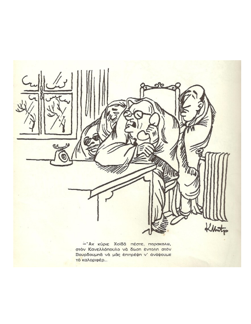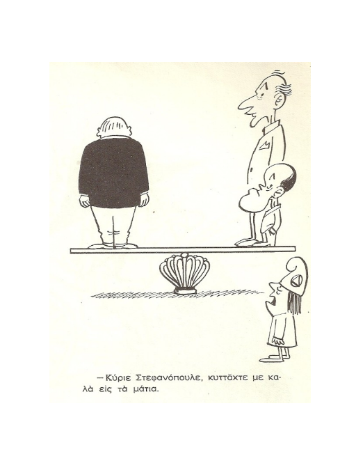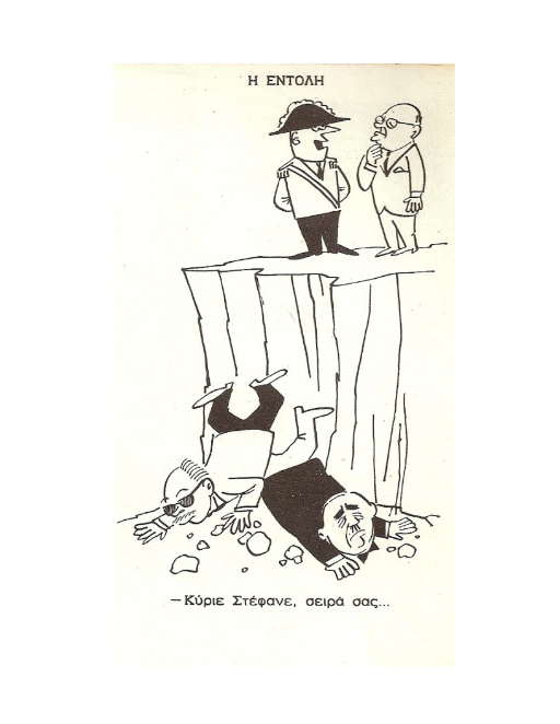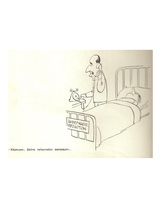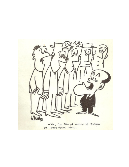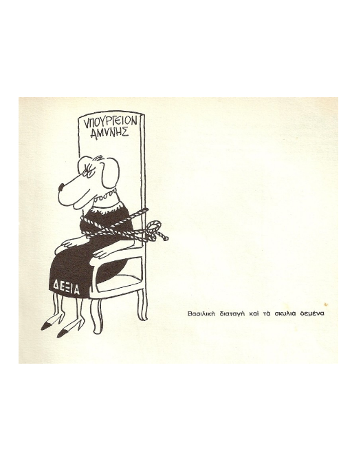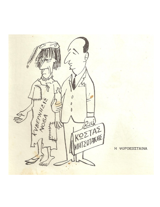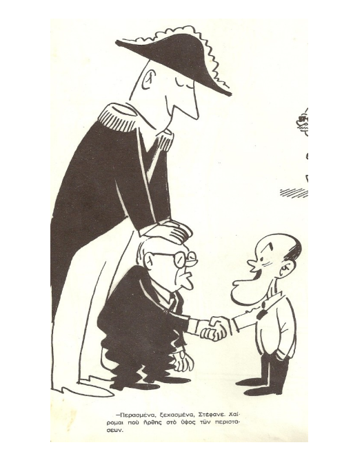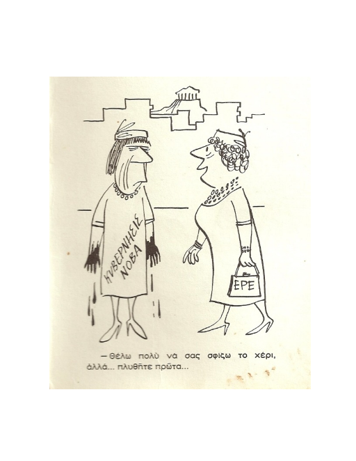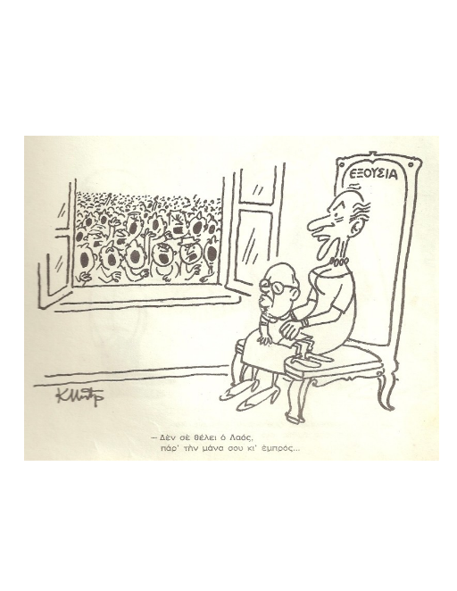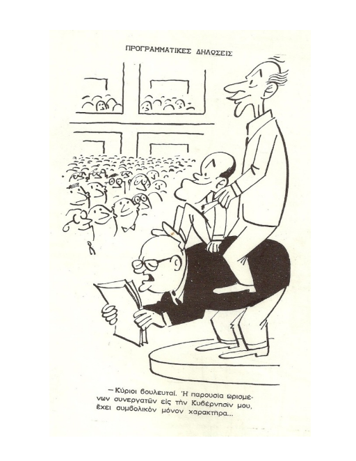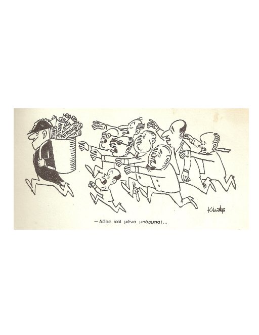 Δώσε και σε μένα μπάρμπα Πολιτικοί διαγκωνίζονται εκλιπαρώντας την εντολή σχηματισμού κυβέρνησης. Στην πρώτη σειρά, πλάι στον Στεφανόπουλο, ο Σπύρος Μαρκεζίνης, αρχηγός του μικρού Κόμματος των Προοδευτικών και μετέπειτα δοτός πρωθυπουργός της Χούντας. Ανάμεσα σε Κανελλόπουλο ικαι Νόβα ίσως είναι ο Κωστόπουλος. Πίσω από τον Μητσοτάκη, ο Πιπινέλης, πρωθυπουργός της ΕΡΕ το 1964 και αργότερα υπουργός εξωτερικών της Χούντας.