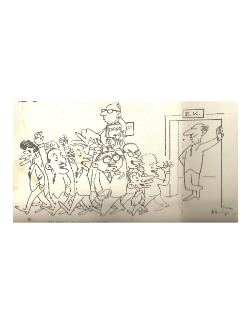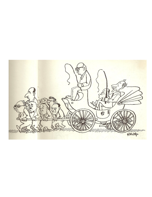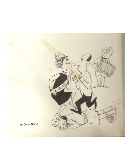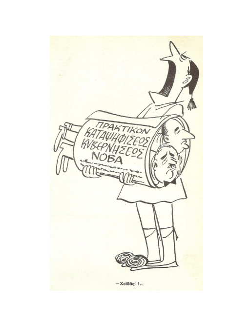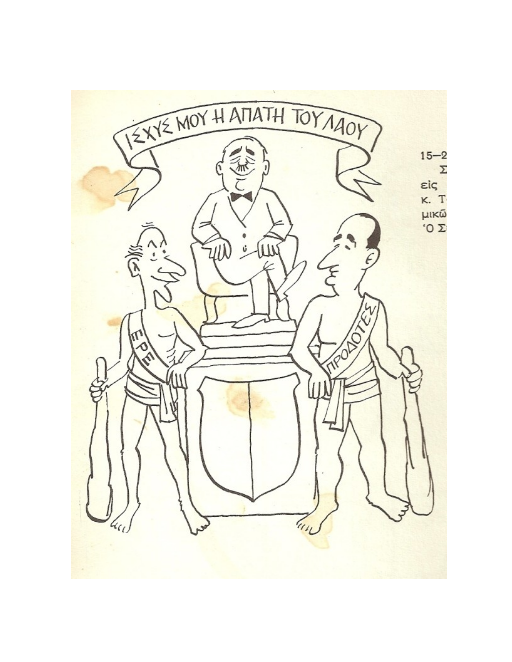 Ισχύς μου η απάτη του λαού Ηρακλείς που στηρίζουν τον Νόβα, αριστερά ο Παν. Κανελλόπουλος, αρχηγός τότε της ΕΡΕ και δεξιά ο Κων. Μητσοτάκης, άτυπος αρχηγός των αποστατών. Να σημειώσω την εξαιρετική ικανότητα του Κ. Μητρόπουλου να δίνει με λίγες γραμμές πρόσωπα εντελώς αναγνωρίσιμα.