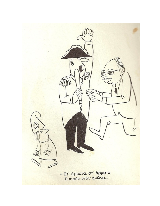 Στ’ άρματα στ’ άρματα Στις 18 Αυγούστου 1964 δίνεται εντολή σχηματισμού κυβέρνησης στον Ηλία Τσιριμώκο, που ήταν υπουργός εσωτερικών στην προηγούμενη κυβέρνηση Παπανδρέου. Ο Τσιριμώκος (1907-1968) είχε αριστερό παρελθόν και είχε συμμετάσχει στην Εθνική Αντίσταση, πράγμα που έδωσε τροφή για άφθονα σαρκαστικά σχόλια, όπως εδώ όπου ο αυλικός τον καλεί χρησιμοποιώντας τα λόγια του γνωστού αντάρτικου τραγουδιού.