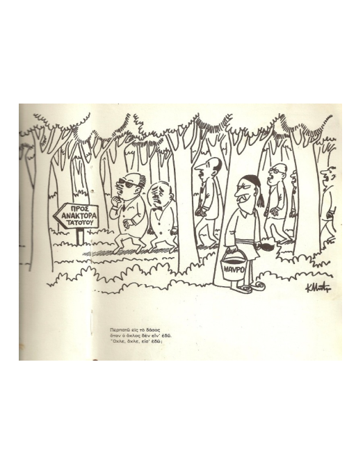 Περπατώ εις το δάσος όταν ο όχλος δεν είναι εδώ Στη γελοιογραφία απεικονίζονται Τσιριμώκος, Νόβας, Μητσοτάκης και Στ. Στεφανόπουλος