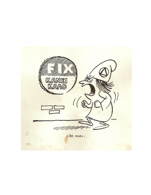 Φιξ κάνει καλό. Σε ποιον; ρωτάει η Δημοκρατία. Οι παλιότεροι θα θυμούνται τη διαφήμιση της Φιξ. Η σύζυγος του Γαρουφαλιά ήταν της οικογένειας Φιξ. Στις διαδηλώσεις, ακούστηκε πολύ το σύνθημα “Φιξ κάνει κακό”, και από τότε οι δικοί μου άρχισαν να πίνουν ΑΜΣΤΕΛ.