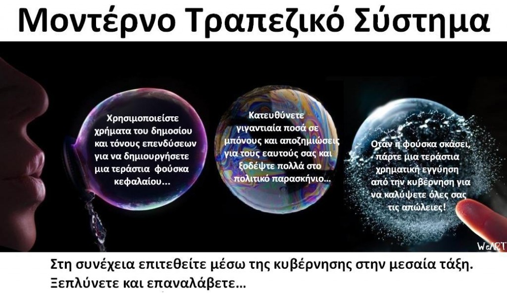 Όλο αυτό βέβαια, σε συνδυασμό με το υπάρχον εξ’ επί τούτου δημιουργημένο τραπεζο-οικονομικό σύστημα (δείτε εικόνα πιο κάτω), δημιουργεί τις κοινωνικές ανισότητες, τον πληθωρισμό, τις κρίσεις, τις αυτοκτονίες, την κατάθλιψη και όλα γνωρίζουμε, μα και βιώνουμε άλλωστε στην Ελλάδα:Αν κάποιος πιστεύει πως οι νόμοι που δημιουργούνται και επιβάλλονται, γινονται για το καλό του καθημερινού ανθρώπου και όχι προς όφελος συμφερόντων με ανταλλάγματα στην πολιτική και δικαστική εξουσία (οι έχοντες έχουν έτσι κι’ αλλιώς πρόσβαση σε αυτή πια, μη το ξεχνάτε), είναι πολύ βαθειά βυθισμένος στην προπαγάνδα.