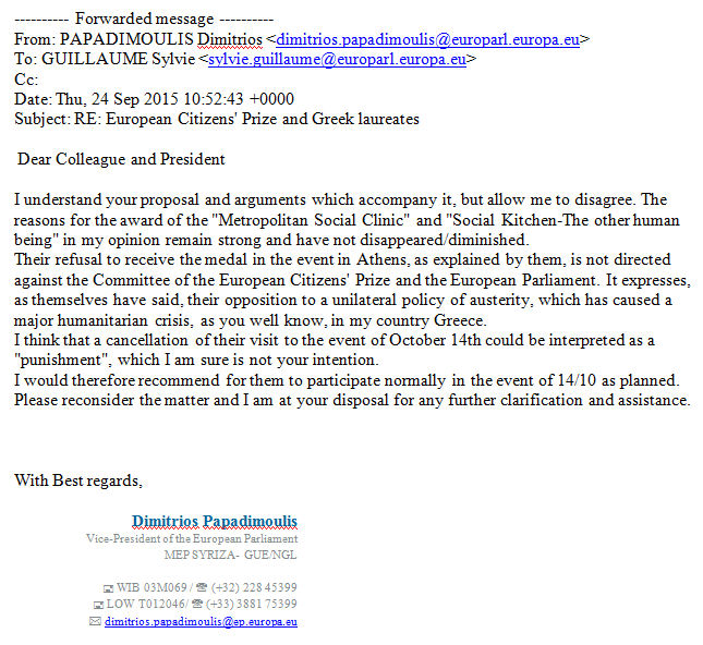 O κ. Παπαδημούλης έστειλε απαντητικό email στην κα. Sylvie Guillaume τονίζοντας ότι η απόφαση μας να αρνηθούμε το βραβείο είχε να κάνει με την επιβολή της λιτότητας στη χώρα μας, η οποία και έχει προκαλέσει ανθρωπιστική κρίση και ζήτησε να πάρουμε μέρος στην εκδήλωση της βράβευσης όπως και αρχικά είχε σχεδιαστεί. Τις επόμενες μέρες ενημερωθήκαμε τηλεφωνικά από τον κ. Παπαδημούλη ότι η κ. Sylvie Guillaume ξεκαθάρισε ότι εάν θέλουμε να πάμε, μπορούμε – θα μας καλύψουν μάλιστα και τα έξοδα – αρκεί να γνωρίζουμε ότι τα ονόματα των δύο Ελληνικών οργανώσεων δεν θα ανακοινωθούν και φυσικά δεν θα μας δοθεί ούτε ο λόγος να μιλήσουμε σε όλους τους παριστάμενους. Εξηγήσαμε στον κ. Παπαδημούλη ότι θέλουμε την απάντηση της κας. Sylvie Guillaume εγγράφως κάτι που φυσικά δεν έκανε.